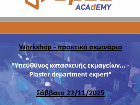 Original price was: 450,00 €.320,00 €Η τρέχουσα τιμή είναι: 320,00 €.Workshop: “Υπεύθυνος κατασκευής εκμαγείων… – Plaster department expert”- Πρακτικό σεμινάριο το Σάββατο 22/11/2025