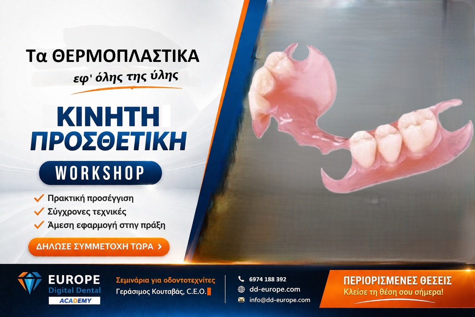 Στον θριαμβευτικό απόηχο του 4ου κατά σειρά session του κύκλου hands on σεμιναρίων κινητής προσθετικής, με τον χαρισματικό εισηγητή και πολύπειρο εργαστηριούχο και οδοντοτεχνίτη από το 1979, Κωνσταντίνο Δάρα,η πρωτοπόρα για τα ελληνικά αλλά και τα διεθνή δεδομένα UP3D ACADEMY ιδρύει την ΑΚΑΔΗΜΙΑ ΘΕΡΜΟΠΛΑΣΤΙΚΩΝ και ΤΗΝ ΑΚΑΔΗΜΙΑ ΑΚΕΤΑΛΙΚΩΝ ΑΓΚΙΣΤΡΩΝ οργανώνοντας τα πρώτα τους σεμινάριο με αντικείμενο τα ΘΕΡΜΟΠΛΑΣΤΙΚΑ και τα ΑΚΕΤΑΛΙΚΑ ΑΓΚΙΣΤΡΑ αντίστοιχα.